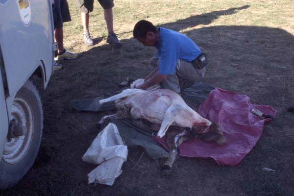 Kurz darauf gehts schon zur Sache: Hufe ab, Fell ab, Kopf ab... Alles mit einem kleinen Taschenmesser!