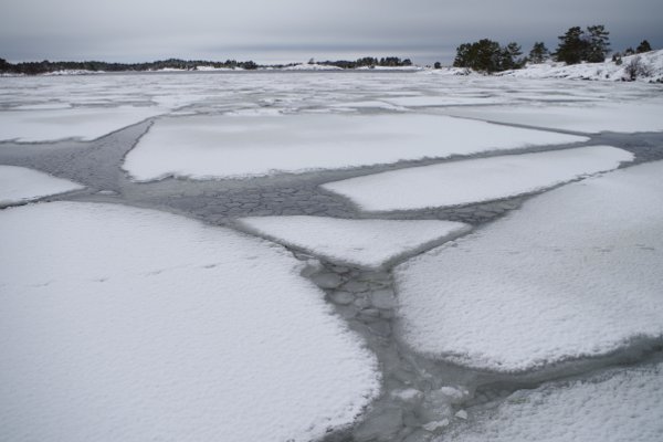 Aufgebrochenes Eis in der Bucht vor Kråkelund. Die Schollen waren etwa 20 cm dick und tragfähig wie schwimmende Flöße. Die Schneeauflage war jedoch wasserdurchtränkt.