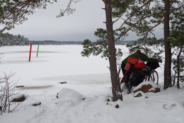 Trotz 8 bis 10 cm Schneeauflage wollten wir es nicht unversucht lassen, auf dem Festeis der gefrorenen Meeresbuchten zu fahren. Am Borholmsfjärden stiegen wir ein...