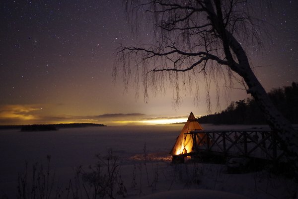 An einem Bootssteg schlugen wir unser Nachtlager auf. Während es tagsüber ständig bewölkt war und schneite, klarte der Himmel nachts manchmal auf.
