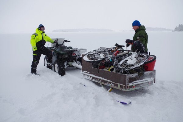 Auf dem Ormödjupet gab es dann 17 cm Schnee - auch Schieben wurde jetzt zur üblen Plackerei... Ein spontanes Mitfahrangebot zur 3 km entfernten Siedlung Strandbo kam da wie gerufen.