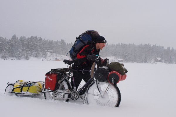 Bei 18 cm Schneeauflage war natürlich wieder Schieben angesagt. Die Gepäckverteilung auf Anhänger und Rücken brachte keine Vorteile... Sven schaffte es noch zu fahren!