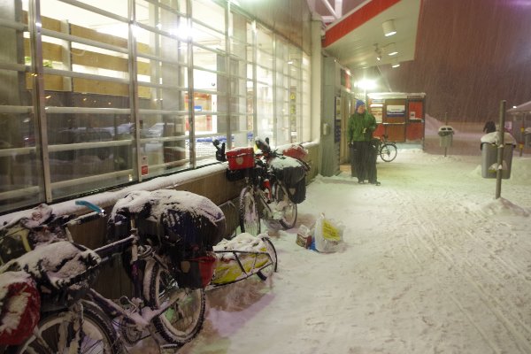 Am Abend erreichten wir bei anhaltendem Starkschneefall die Küstenstadt Västervik und deckten uns in einem Supermarkt mit neuem Proviant ein.