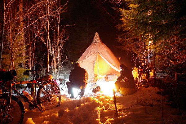 Kampiert haben wir immer im Schnee. Mit dabei war wieder Jakobs "Bison"-Tipi, welches ohne Innenzelt nur 4 kg wiegt und genug Bewegungsfreiheit bietet, vor allem beim Umziehen.