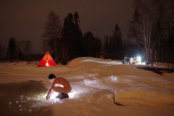 Auf einer kleinen unbewohnten Schäreninsel schlugen wir unser letztes gemeinsames Lager auf. Eine Brackwasserpfütze am Ufer ergab sich als willkommene Waschgelegenheit...