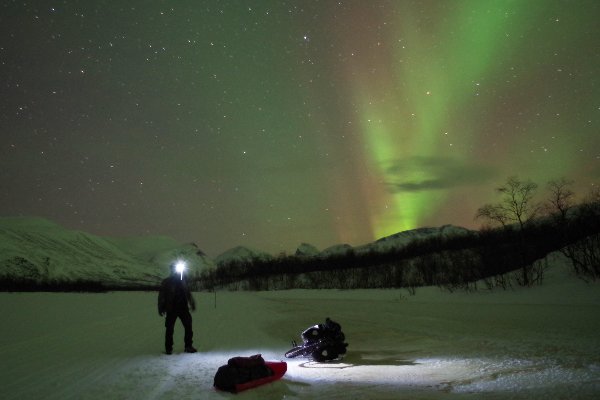 Während ich mit Kopflampe noch einige Stunden in die Nacht hinein ging, stieg am Nordhimmel langsam ein Polarlicht empor und tauchte die stille Berglandschaft in ein mystisches Grün.