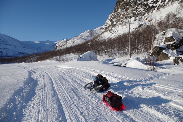 Um auf der Schneemobilpiste besser voranzukommen, hatte ich einen Teil des Gepäcks auf eine Rollpulka ausgelagert. Auf Freiflächen war die Piste aber so fest, dass ich auch voll bepackt drauf fahren konnte.