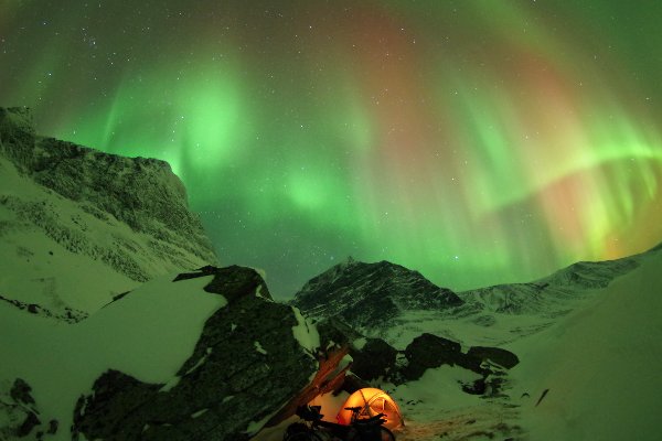 Als ich in dem engen Durchgangstal oberhalb der Bergstation mein Nachtlager aufschlug, wurde ich von einem regelrechten Lichtspektakel überrascht. Noch nie hatte ich ein derart prächtiges Polarlicht gesehen...