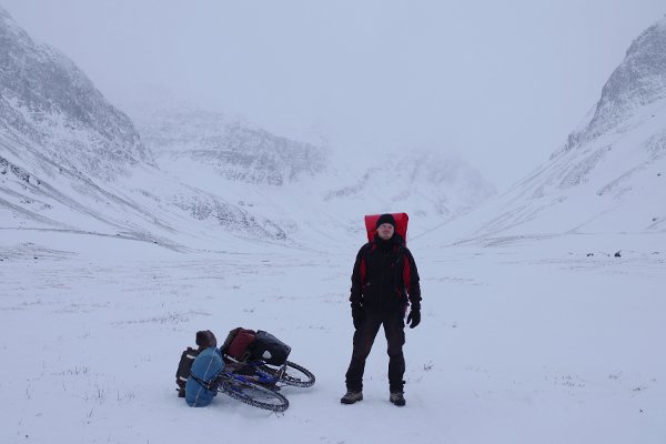 Am nächsten Tag musste ich dann doch schon umkehren. Kräftiger Wind hatte die Piste vollkommen verweht und auch der Schnee wurde immer weicher. Da mir die Pulka abwärts wiederholt ins Rad knallte, trug ich sie für eine Weile mit dem daran befestigten Rucksack auf dem Rücken. |
