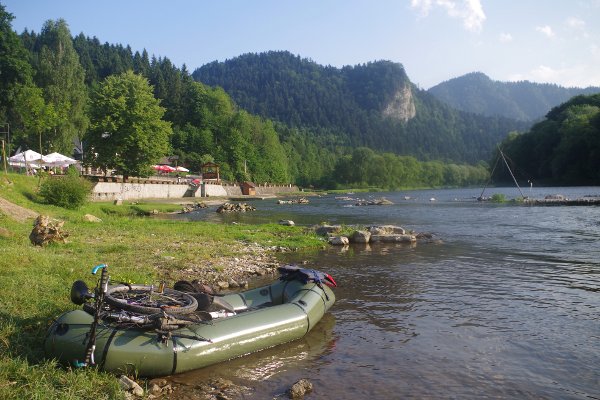 Das Schlauchboot bzw. Packraft mit Rad und Gepäck beim Anlanden in Szczawnica.
