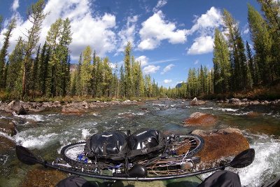 Wie also da durch? Die Antwort kam, als ich vor zwei Jahren auf das Thema Packrafting stieß: kombinierte Land-Wasser-Reisen mit superleichten, aber robusten Schlauchbooten. Die Möglichkeit, auch Wasserwege mit in die Routenplanung einer Radtour einzubeziehen, warf ein ganz neues Licht auf mein Vorhaben. Denn ein Packraft – leicht und klein genug, um es als normales Gepäckstück mitzuführen – würde mir als Radreisenden plötzlich das Überwinden von unüberwindbar erscheinenden Wildnisregionen ermöglichen. Ich legte mir einen Packraft-Zweier zu. Dieser erfüllte genau meine Ansprüche, da er in der Solonutzung locker mit allem beladen werden kann: Fahrrad, Ausrüstung für vier Jahreszeiten und Proviant für mehrere Wochen. Insofern hatte ich mich damit schon für ein richtiges Expeditionsraft entschieden, mit dem ich richtig lange autark unterwegs sein kann. Ein paar mehrtägige Probetouren in Polen (Dunajec, Pilica, Pliszka, Drawa) haben mich letztlich überzeugt, es auch in abgelegenen Gebieten Sibiriens einzusetzen.