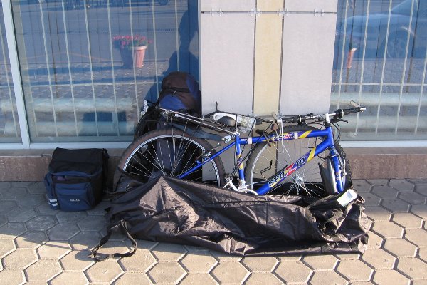 Ankunft am Flughafen Manas (650 m). Mit dabei diesmal der "Yak", den ich 6 Jahre zuvor auf einem Bazar in der Mongolei erstanden hatte. Laufräder, Tretlager und Pedalen wurden aber inzwischen ausgetauscht.