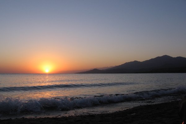 Sonnenaufgang am Yssyk-Köl (1600 m). Zwei Tage fuhr ich am Südufer des Sees entlang.